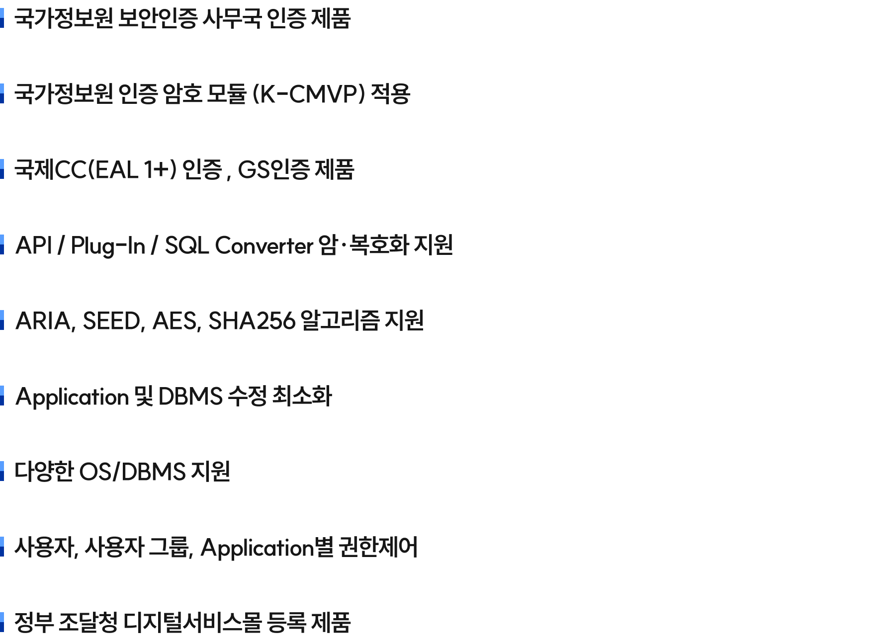 국가정보원 인증 암호 모듈을 적용한 DB 암호화 솔루션입니다.