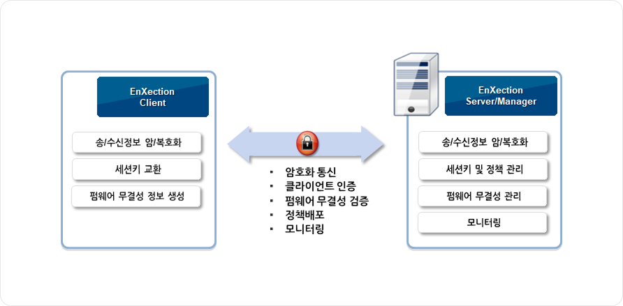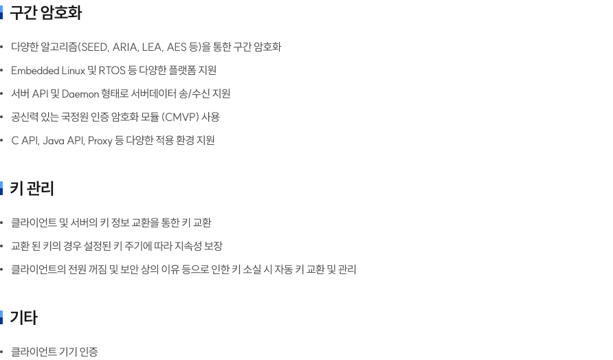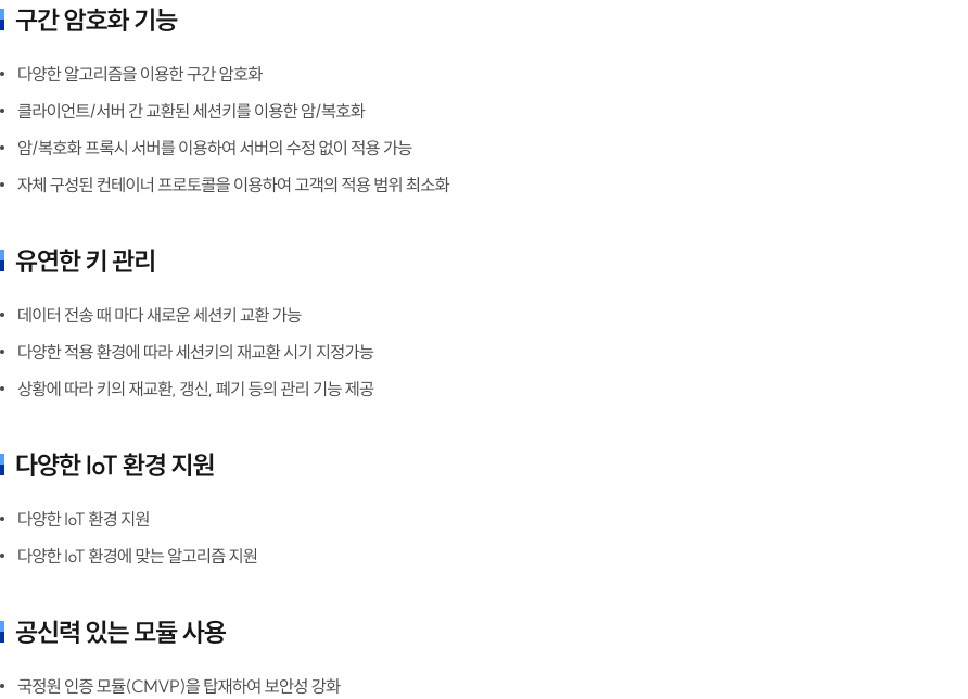 IoT 구간 암호화 솔루션 i-EnXection과 모바일 구간 암호화 솔루션 m-EnXection은 다양한 알고리즘을 통한 송/수신 정보 암호화, 세션키 생성 및 관리, 서버기반 키관리 기능을 제공합니다.