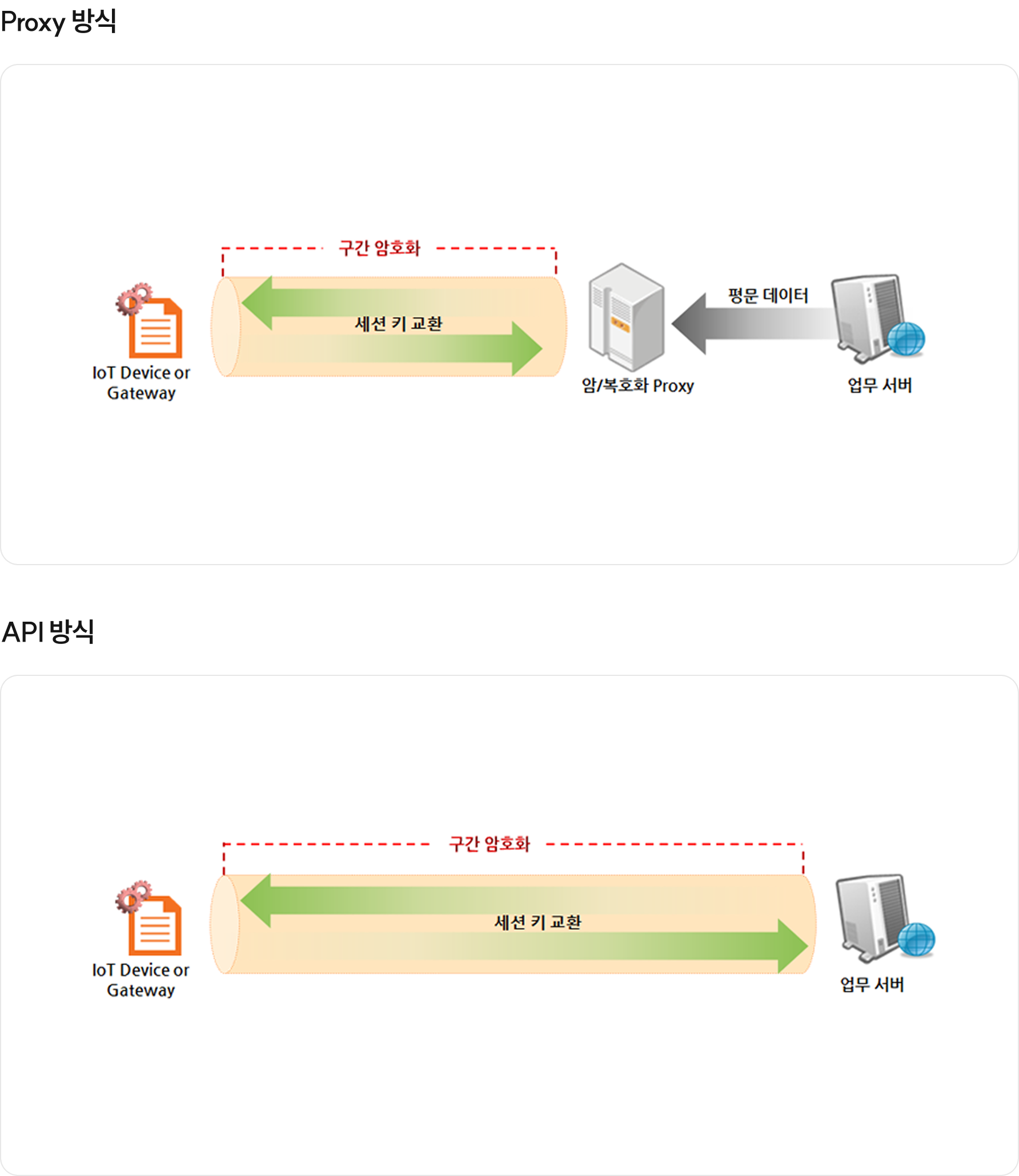 구간 암호화 방식은 2가지로 제공되며, 첫번째는 Proxy 방식으로 업무 서버를 수정할 필요 없이 앞단의 키교환 및 암/복호화 Proxy 를 통하여 송/수신되는 모든 데이터를 암/복호화 하는 방식, 그리고 두번째는 API 방식으로 직접 업무 서버에 키 교환 및 암/복호화 API 를 적용하여 송/수신 데이터를 암/복호화 방식으로 제공 될 수 있습니다